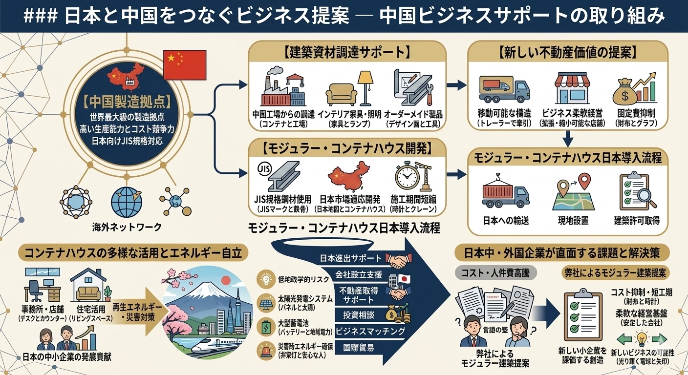 弊社では、日本と中国の中小企業を結びつけるビジネスサポートを長年にわたり行っています。中国は世界最大級の製造拠点を持ち、多くの分野で高い生産能力とコスト競争力を備えています。一方、日本の企業は品質管理やブランド力、そして高度な技術力を持っています。この両国の強みを結びつけることで、新しいビジネスの可能性が生まれると考えています。