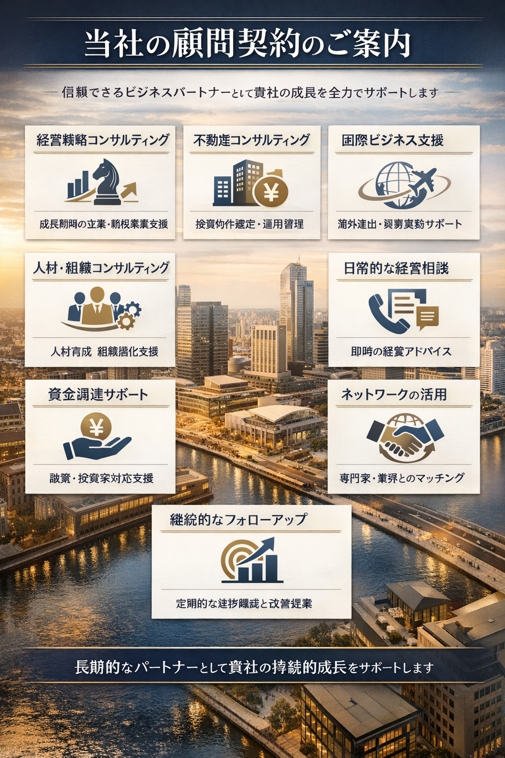当社の顧問契約は、企業経営者および個人事業主の皆様が直面する多様な経営課題に対し、専門的かつ実践的なソリューションを提供する包括的なコンサルティングサービスです。長期的なパートナーシップを通じて、お客様の持続的な成長と競争力強化を実現いたします。